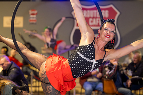 In het Simone FM Route 66 Café ben je niet alleen aan het juiste adres voor goede tunes en gezelligheid. Op gezette tijden knalt hier ook een spectaculaire paaldansshow. Dynamisch, energiek en vol attitude: een optreden waarin flair, kracht, techniek en entertainment samenkomen.